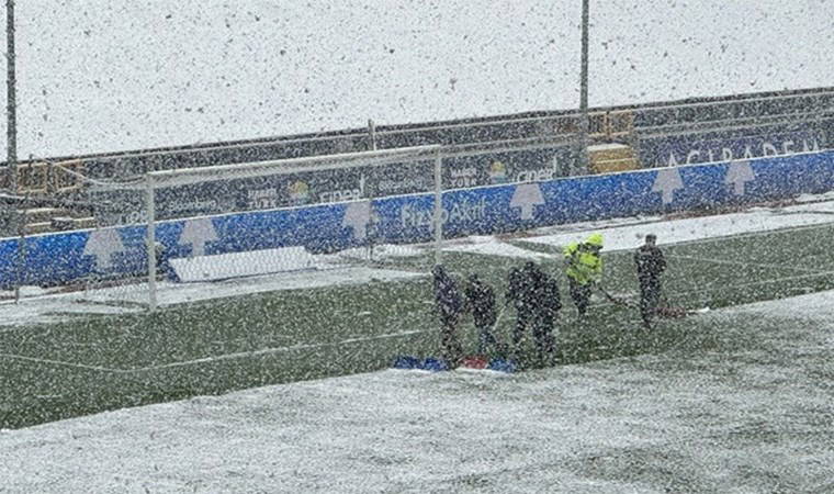 Ekipler karşılaşma öncesi zeminde kar temizleme çalışmalarını sürdürüyor.