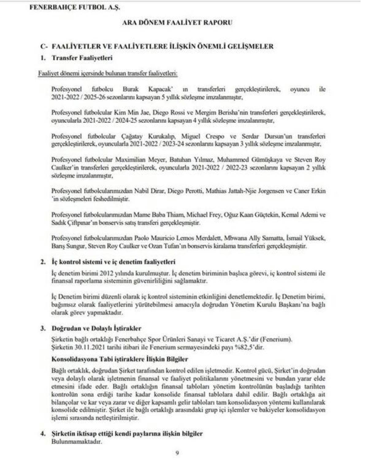 Fenerbahçe Kulübü'nün yayımladığı faaaliyet raporunda dikkat çaken maddede "Profesyonel futbolcular Kim Min Jae, Diego Rossi ve Mergim Berisha'nın transferleri gerçekleştirilerek oyuncularla 2021-2022 / 2024- 25 sezonlarını kapsayan 4 yıllık sözleşme imzalanmıştır." açıklaması dikkatlerden kaçmadı.
