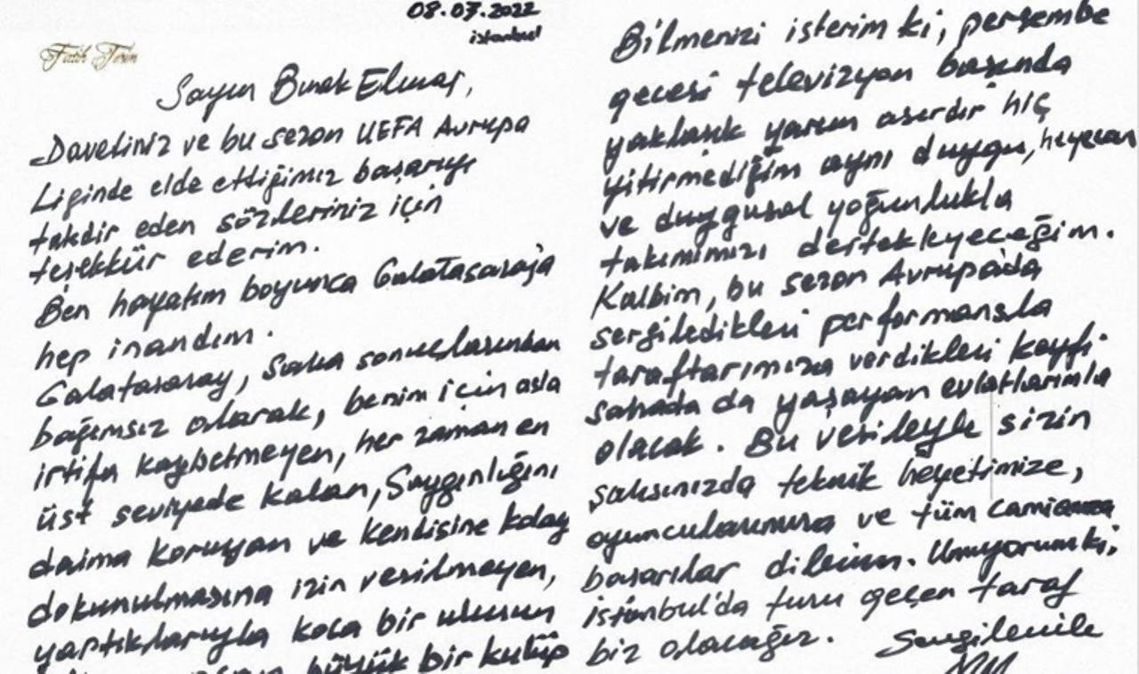 "Sayın Burak Elmas, davetiniz ve bu sezon UEFA Avrupa Ligi'nde elde ettiğimiz başarıyı takdir eden sözleriniz için teşekkür ederim. Ben hayatım boyunca Galatasaray'a hep inandım. Galatasaray, saha sonuçlarından bağımsız olarak, benim için asla irtifa kaybetmeyen, her zaman en üst seviyede kalan, saygınlığını daima koruyan ve kendisine kolay da dokunulmasına izin verilmeyen, yaptıklarıyla koca bir ulusun ufkunu açan büyük bir kulüp oldu. Bilmenizi isterim ki, perşembe gecesi televizyon başında yaklaşık yarım asırdır hiç yitirmediğim aynı duygu, heyecan ve duygusal yoğunlukla takımımızı destekleyeceğim. Kalbim, bu sezon Avrupa'da sergiledikleri performansla taraftarımıza verdikleri keyfi sahada da yaşayan evlatlarımla olacak. Bu vesileyle sizin şahsınızda teknik heyetimize, oyuncularımıza ve tüm camiamıza başarılar dilerim. Umuyorum ki, İstanbul'da turu geçen taraf biz olacağız."