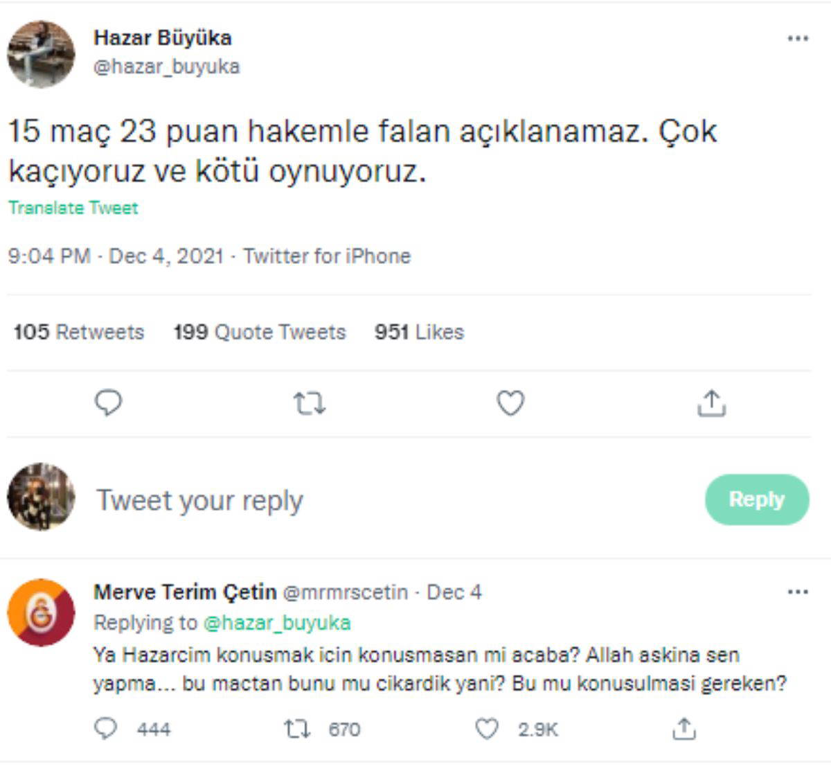 Ünlü spor sunucusu Şansal Büyüka'nın oğlu Hazar Büyüka, "15 maç 23 puan hakemle falan açıklanamaz. Çok kaçıyoruz ve kötü oynuyoruz" ifadelerini kullandığı bir paylaşım yaptı. Bu sözlere Fatih Terim'in kızı Merve Terim Çetin kayıtsız kalmadı.