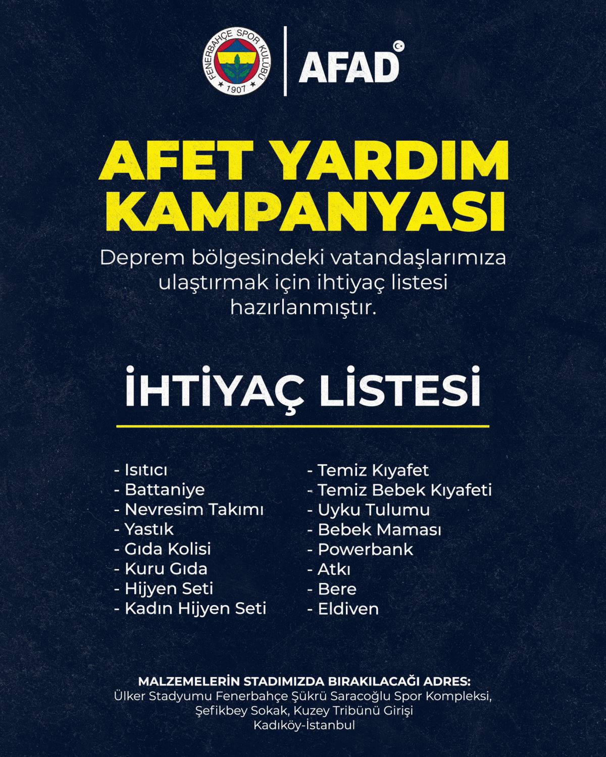 "Ülkemizi hüzne boğan deprem felaketinden etkilenen vatandaşlarımız için halkımızın AFAD ihtiyaç listesi kapsamında deprem bölgesine yapmak istedikleri malzeme destekleri için Ülker Stadyumu Fenerbahçe Şükrü Saracoğlu Spor Kompleksi'ni kullanıma açtığımızı, toplanacak tüm malzemeleri Kadıköy Belediyesi ile koordineli olarak afet bölgesine göndereceğimizi halkımızın bilgisine sunuyoruz.