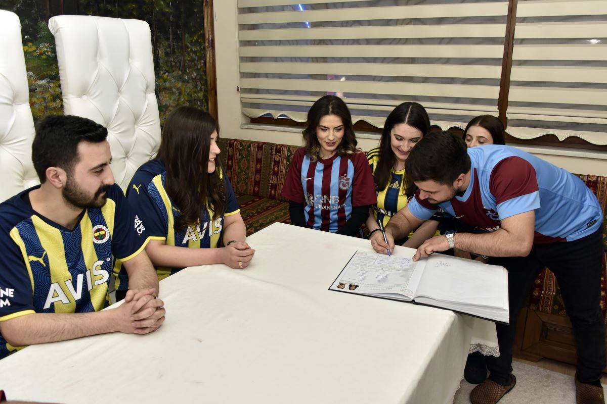 Torul Belediyesi Sosyal Tesisleri’nde kıyılan nikahın şahitleri de Trabzonspor ve Fenerbahçe formaları giyerek törene katıldı.
