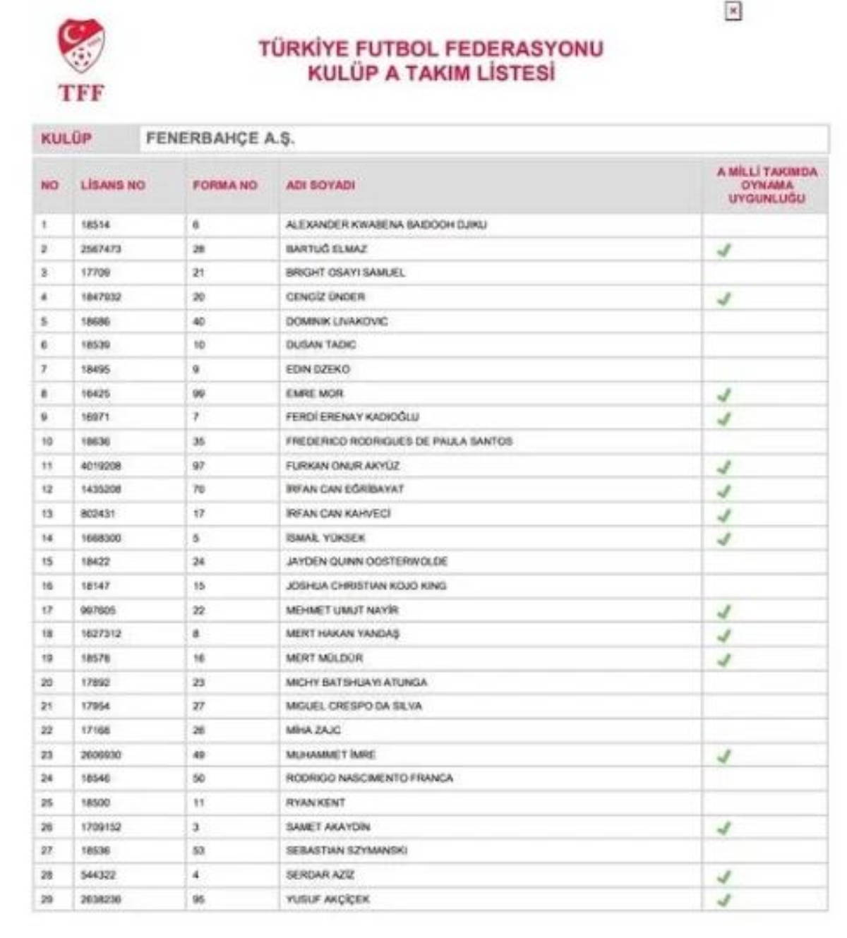 İşte Fenerbahçe'nin TFF'ye bildirdiği oyuncu listesi;