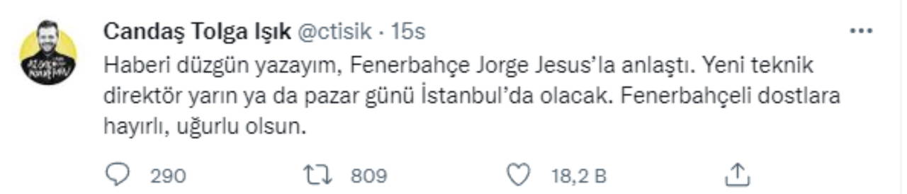 Gazeteci Candaş Tolga Işık da sosyal medya hesabından Fenerbahçelileri heyecanlandıran bir paylaşım yaptı. Işık, "Haberi düzgün yazayım, Fenerbahçe Jorge Jesus’la anlaştı. Yeni teknik direktör yarın ya da pazar günü İstanbul’da olacak. Fenerbahçeli dostlara hayırlı, uğurlu olsun" sözlerine yer verdi.