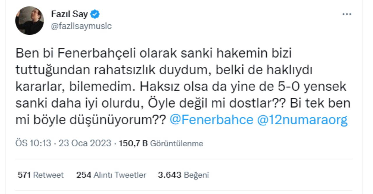 Fenerbahçe taraftarı olan ünlü piyanist Fazıl Say, sarı-lacivertli takımın Ümraniyespor'u yendiği maç sonrası dikkat çeken bir paylaşımda bulundu.