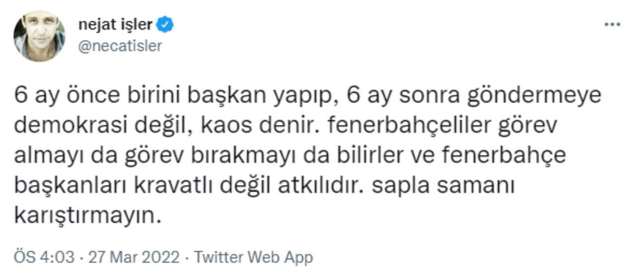 Twitter'dan bir paylaşım yapan Nejat İşler, "6 ay önce birini başkan yapıp, 6 ay sonra göndermeye demokrasi değil, kaos denir. Fenerbahçeliler görev almayı da görev bırakmayı da bilirler ve Fenerbahçe başkanları kravatlı değil atkılıdır. Sapla samanı karıştırmayın" dedi.