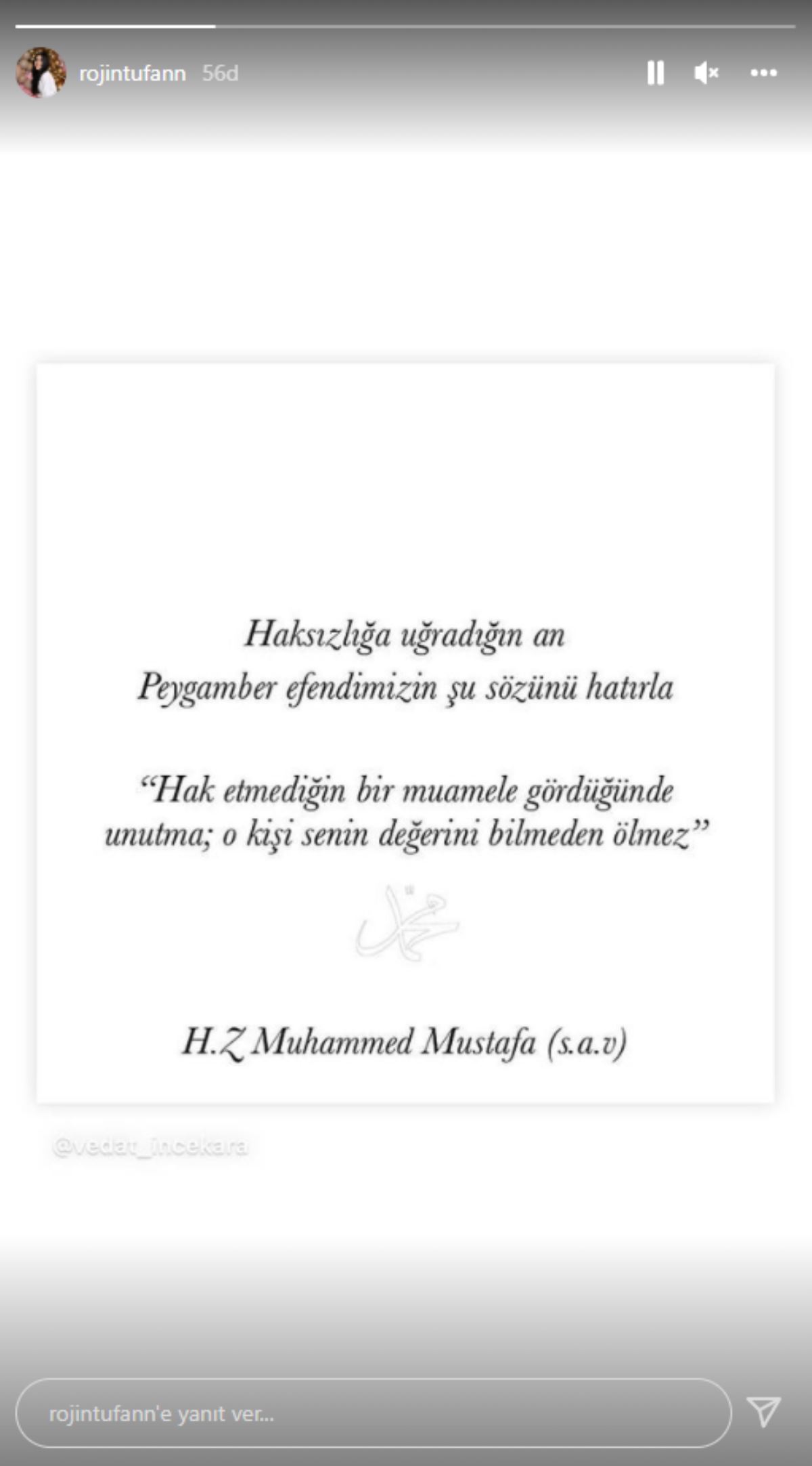 Rojin Tufan'ın paylaşımında, "Haksızlığa uğradığın an peygamber efendimizin şu sözünü hatırla, ' Hak etmediğin bir muamele gördüğünde unutma; o kişi senin değerini bilmeden ölmez' - H.z. Muhammed Mustafa" ifadeleri yer aldı.