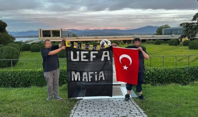 UEFA binasına giden Fenerbahçeli taraftarlar, "UEFA MAFIA" yazılı bir pankart açıp poz verdi.