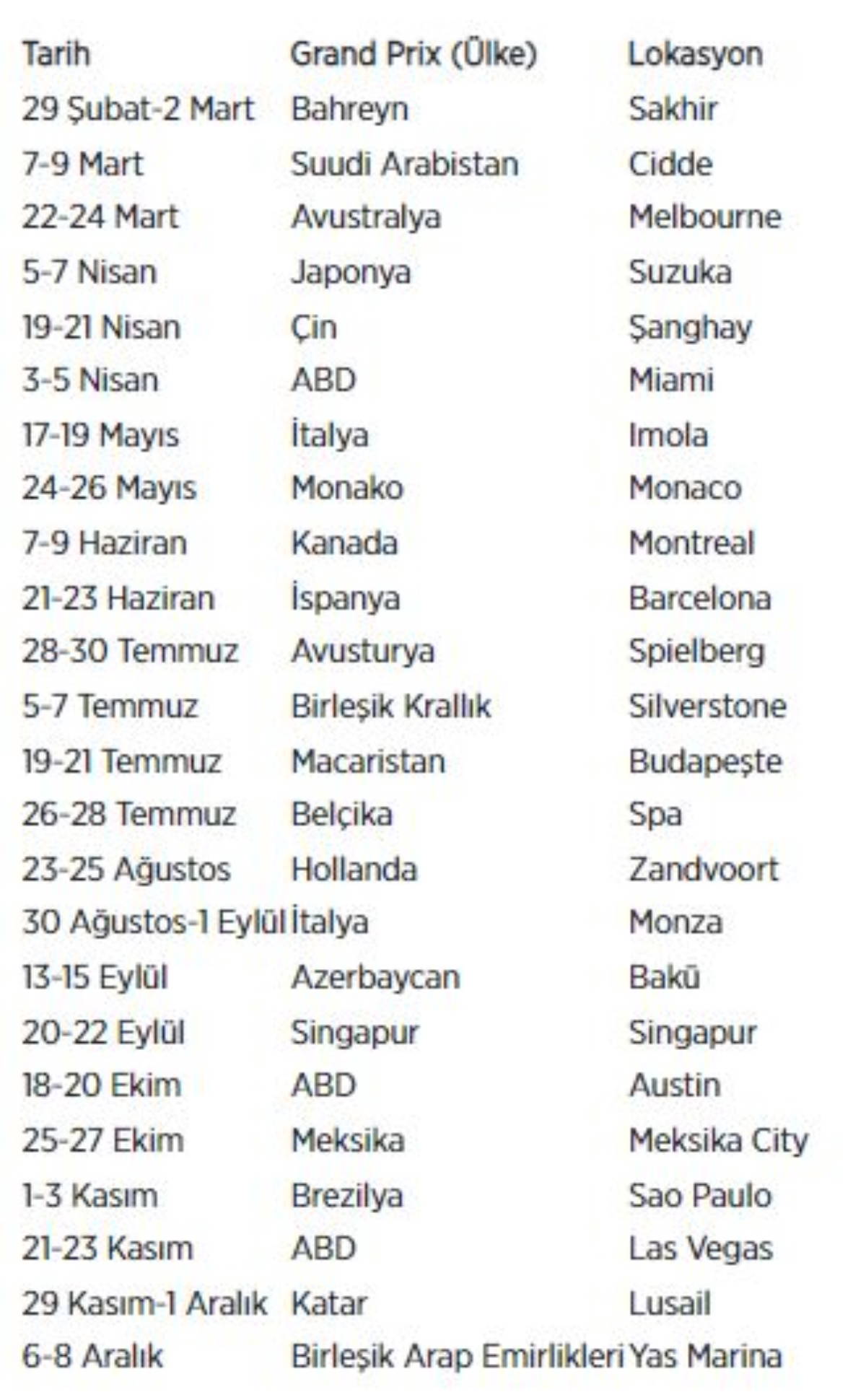 Formula 1'den yapılan açıklamada, "Takvimde 24 yarış yer alıyor ve Formula 1 sezonu, 2 Mart'ta Bahreyn'de başlayıp 8 Aralık'ta Birleşik Arap Emirlikleri'nde sona eriyor." bilgisi verildi.