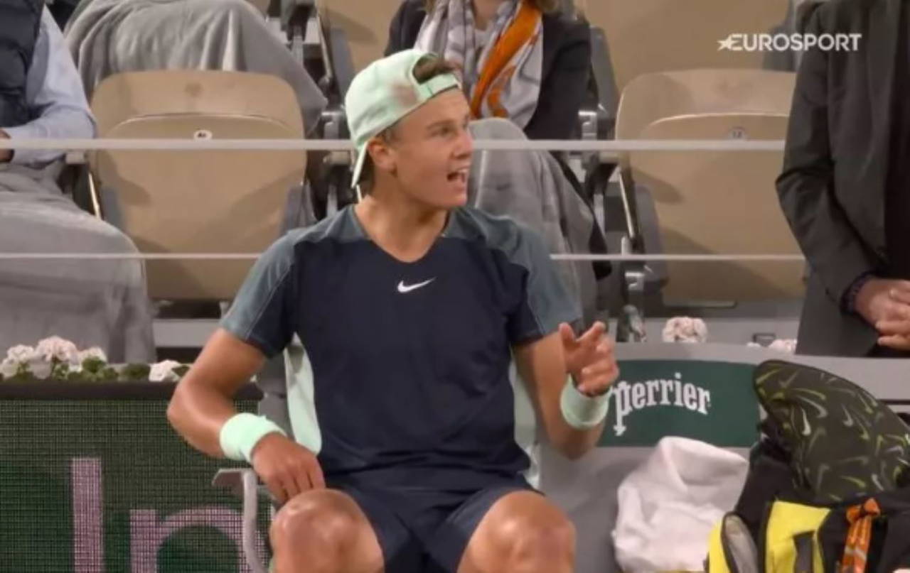 19 yaşındaki Danimarkalı tenisçi Holger Rune, setlerde geriye düştüğü bir oyun arasında koltuğuna geldikten sonra sinirli şekilde antrenörüyle birlikte oyuncu locasında oturan annesine Danca 'forlade' diye defalarca bağırırken ekrana geldi. İngilizce 'leave' anlamına gelen kelime Türkçeye 'terk et' şeklinde çevrilebilir.