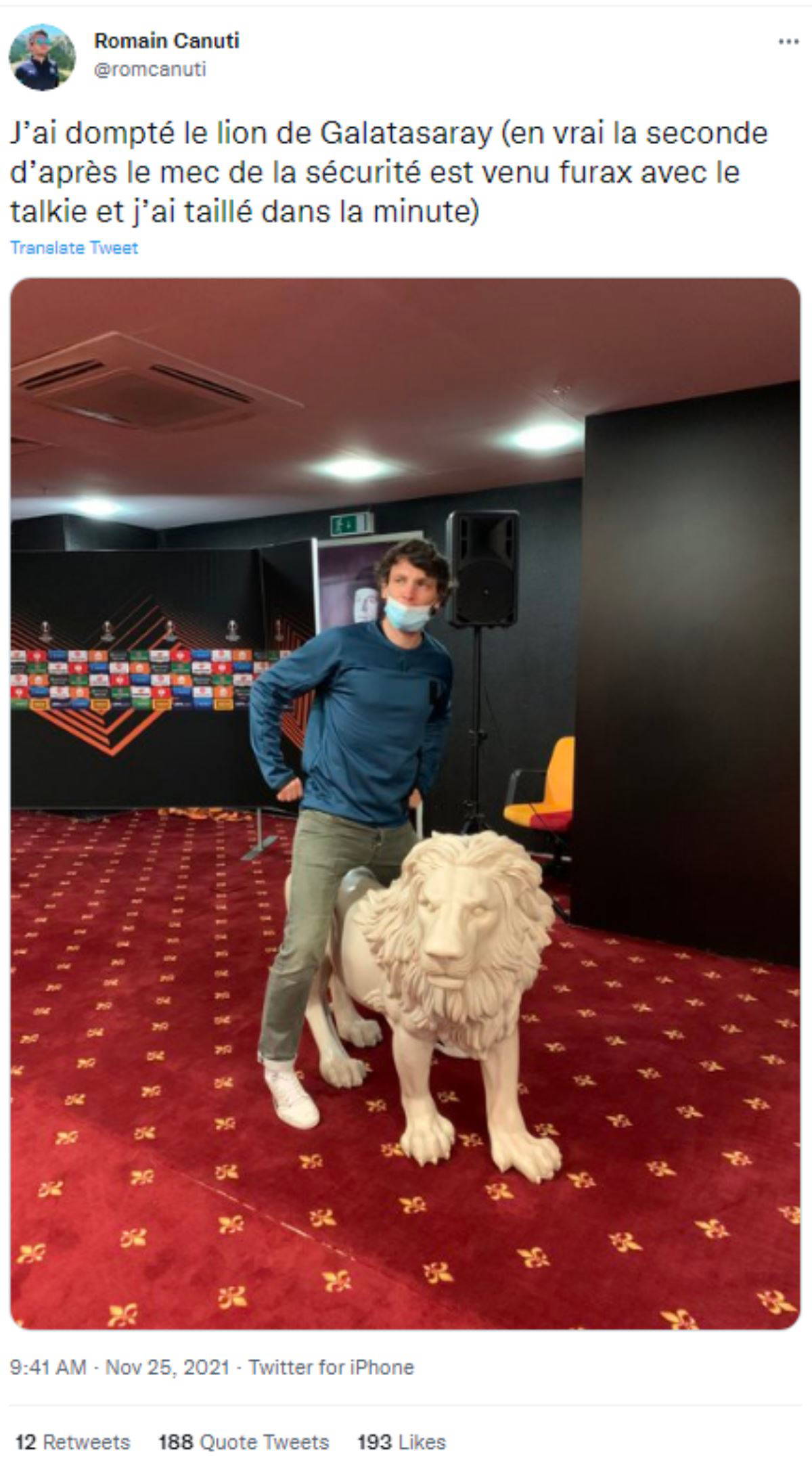 Teknik direktörlerin düzenlediği basın toplantısı sonrasında Galatasaray'ın sembolü olan aslanla poz veren Romain Canuti, sosyal medya hesabından "Aslanı evcilleştirdim" paylaşımını yaptı.