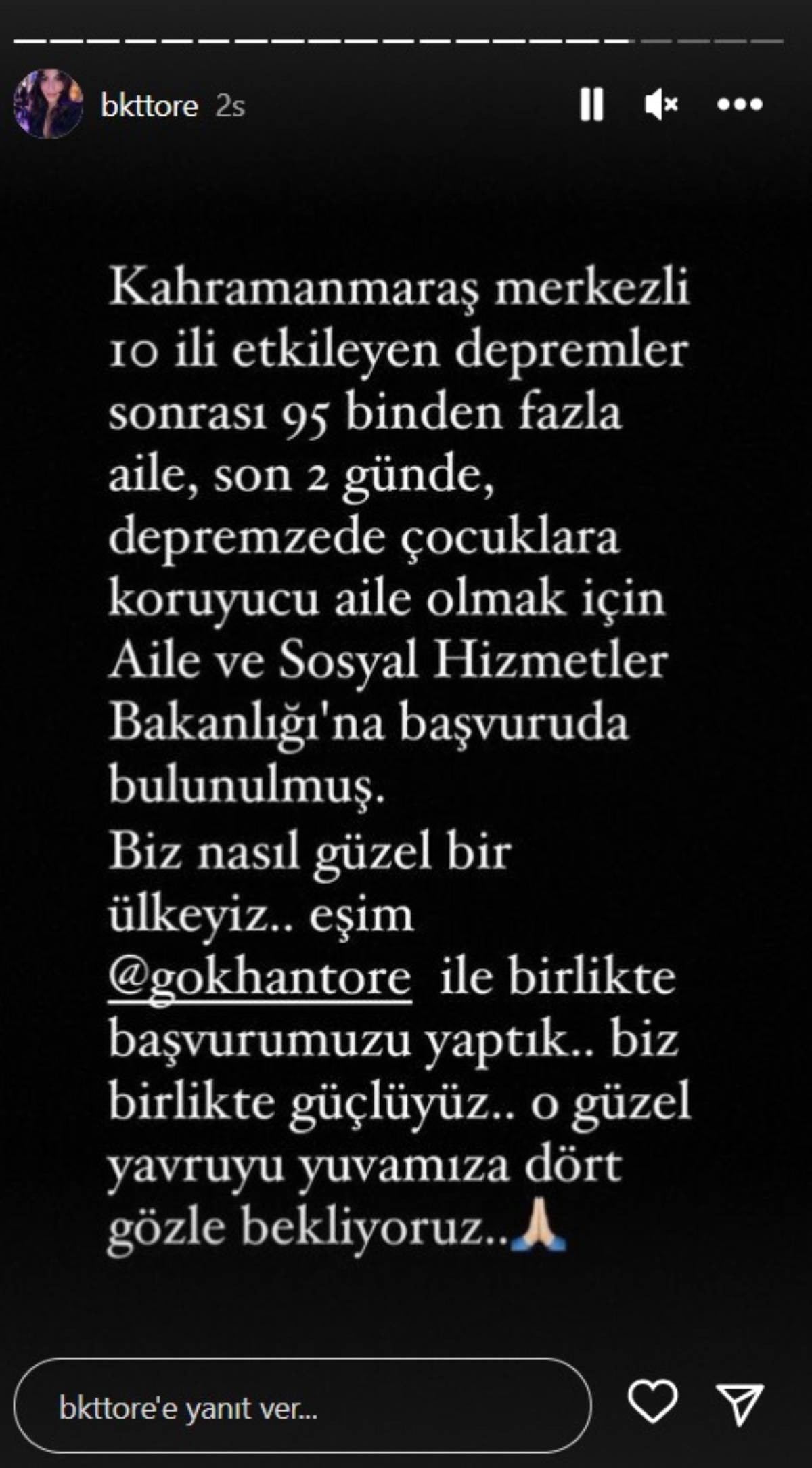 Buket Töre'nin açıklamalarında, "Kahramanmaraş merkezli 10 ili etkileye depremler sonrası 95 binden fazla aile, son 2 günde, depremzede çocuklara koruyucu aile olmak için Aile ve Sosyal Hizmetler Bakanlığı'na başvuruda bulunulmuş. Biz nasıl güzel bir ülkeyiz... Eşim Gökhan Töre ile birlikte başvurumuzu yaptık. Biz birlikte güçlüyüz. O güzel yavruyu yuvamıza dört gözle bekliyoruz" ifadeleri yer aldı.