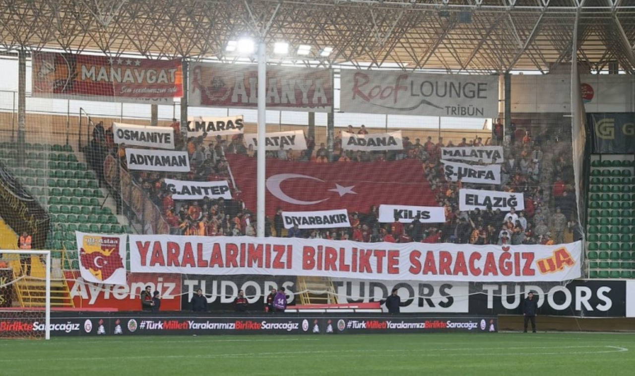 Takımları yerine "Türkiye" tezahüratında bulunan taraftarlar, yanlarında getirdikleri oyuncakları depremzede çocuklara ulaştırılmak üzere stat girişinde oluşturulan alana bıraktı.