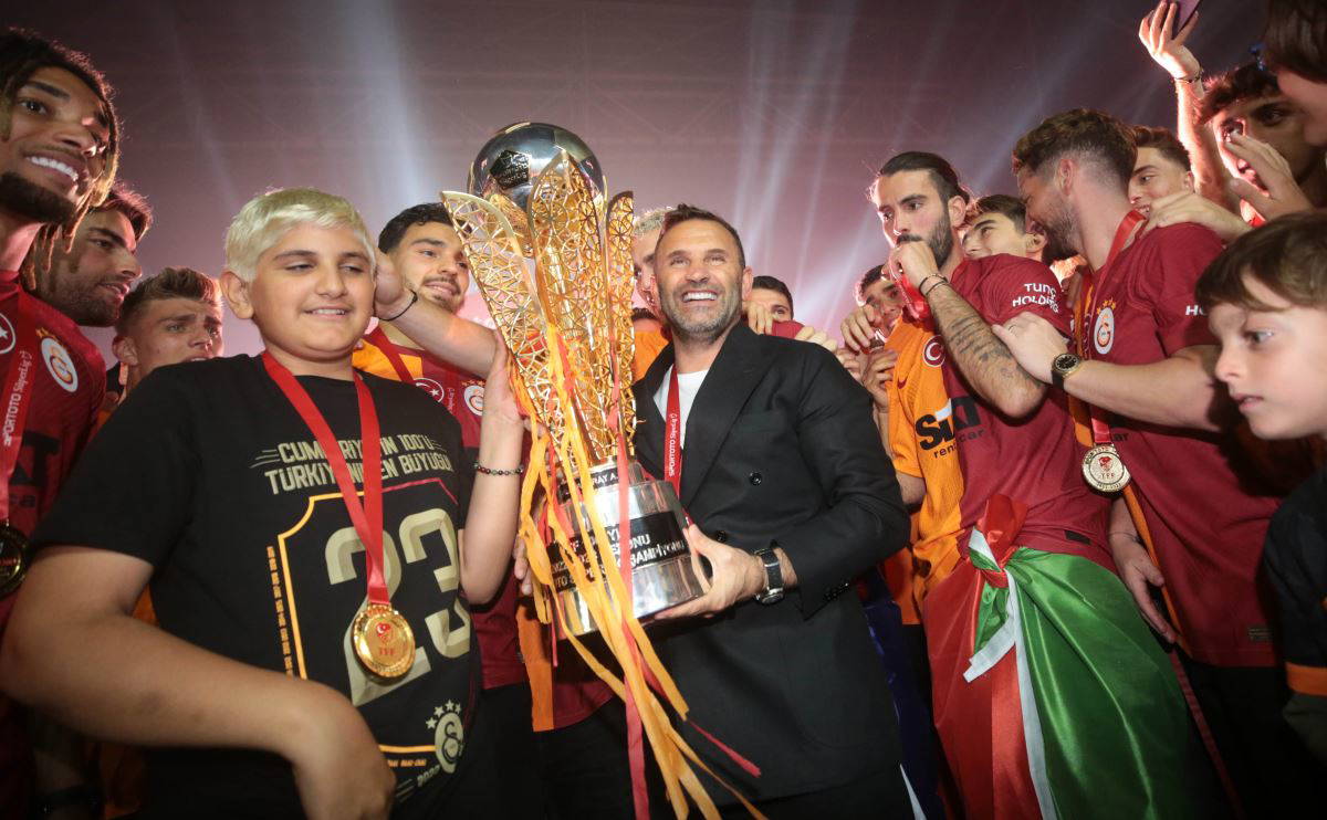 Galatasaray ile ilk sezonunda şampiyonluğu ulaşan Teknik Direktör Okan Buruk, kutlamalara eşi Nihan Buruk ve oğlu Ali Yiğit ile çıktı. Buruk madalyasını aldıktan sonra oğlu Ali Yiğit’e verdi.
