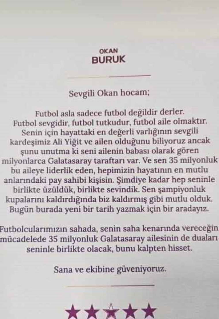 Sevgili Okan hocam; Futbol asla sadece futbol değildir derler. Futbol sevgidir, futbol tutkudur, futbol aile olmaktır. Senin için hayattaki en değerli varlığının sevgili kardeşimiz Ali Yiğit ve ailen olduğunu biliyoruz ancak şunu unutma ki seni ailenin babası olarak gören milyonlarca Galatasaray taraftarı var. Ve sen 35 milyonluk bu aileye liderlik eden, hepimizin hayatının en mutlu anlarındaki pay sahibi kişisin. Şimdiye kadar hep seninle birlikte üzüldük, birlikte sevindik. Sen şampiyonluk kupalarını kaldırdığında biz kaldırmış gibi mutlu olduk. Bugün burada yeni bir tarih yazmak için bir aradayız. Futbolcularımızın sahada, senin saha kenarında vereceğin mücadelede 35 milyonluk Galatasaray ailesinin de duaları seninle birlikte olacak, bunu kalpten hisset. Sana ve ekibine güveniyoruz."