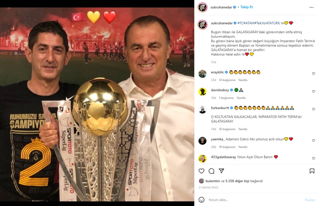 Hanedar, sosyal medyadan Fatih Terim'le birlikte bir fotoğrafını paylaşarak, "Bugün itibarı ile GALATASARAY’daki görevimden istifa etmiş bulunmaktayım. Bu görevi bana layık gören değerli büyüğüm İmparator Fatih Terim’e ve geçmiş dönem Başkan ve Yönetimlerine sonsuz teşekkür ederim.