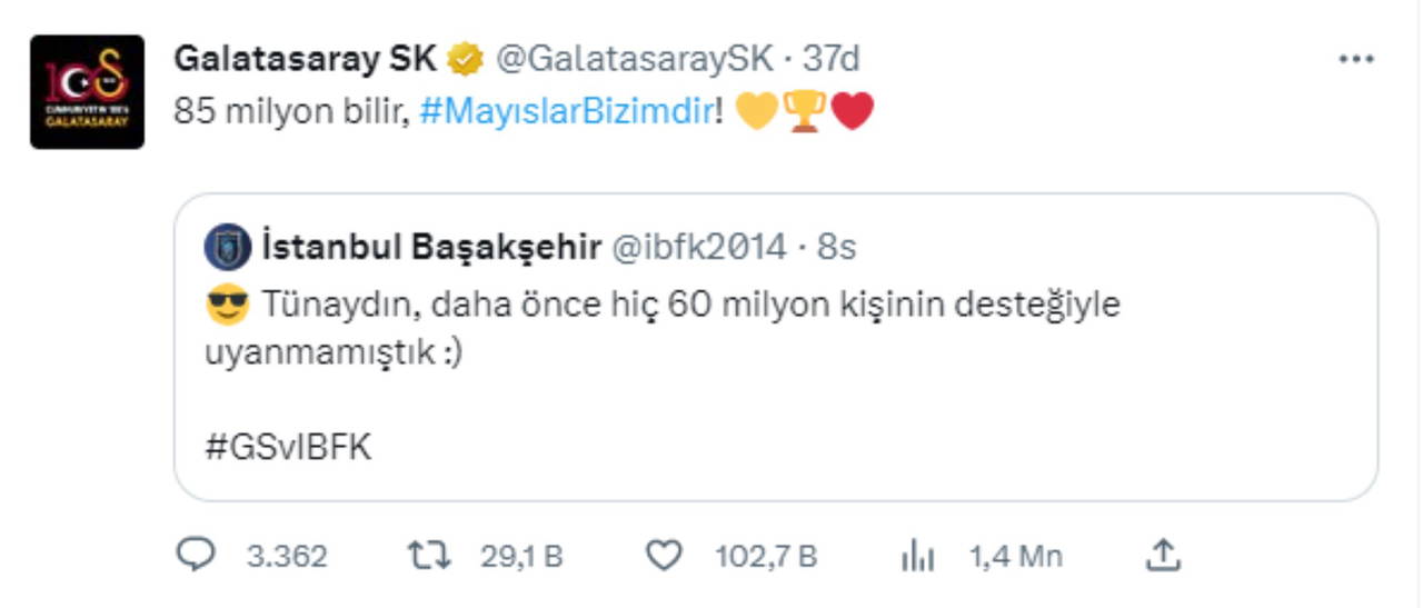 Galatasaray, rakibinin paylaşımını alıntılayarak, "85 milyon bilir, #MayıslarBizimdir!" şeklinde paylaşım yaptı.