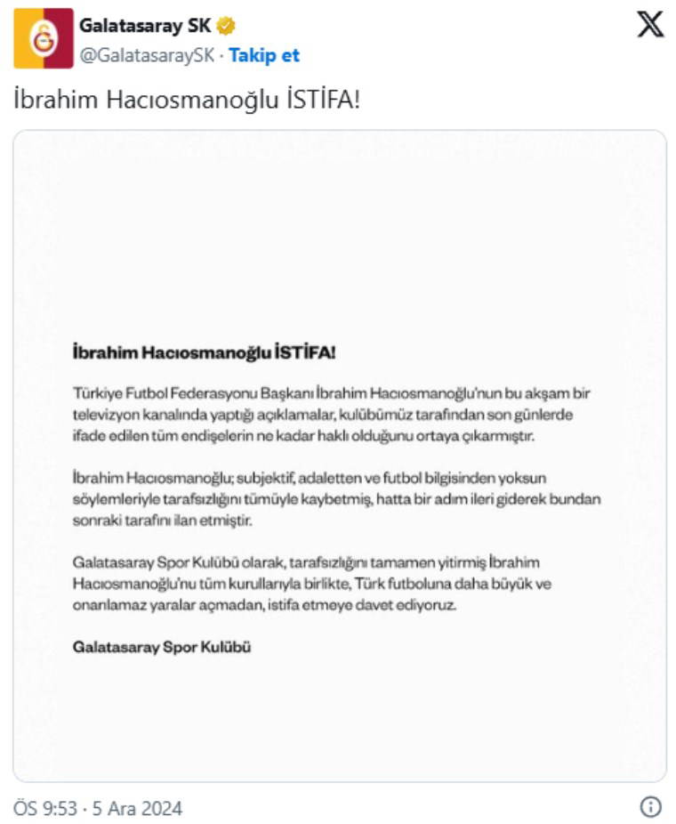 "Türkiye Futbol Federasyonu Başkanı İbrahim Hacıosmanoğlu'nun bu akşam bir televizyon kanalında yaptığı açıklamalar, kulübümüz tarafından son günlerde ifade edilen tüm endişelerin ne kadar haklı olduğunu ortaya çıkarmıştır. İbrahim Hacıosmanoğlu; subjektif, adaletten ve futbol bilgisinden yoksun söylemleriyle tarafsızlığını tümüyle kaybetmiş, hatta bir adım ileri giderek bundan sonraki tarafını ilan etmiştir. Galatasaray Spor Kulübü olarak, tarafsızlığını tamamen yitirmiş İbrahim Hacıosmanoğlu'nu tüm kurullarıyla birlikte, Türk futboluna daha büyük ve onarılamaz yaralar açmadan, istifa etmeye davet ediyoruz."