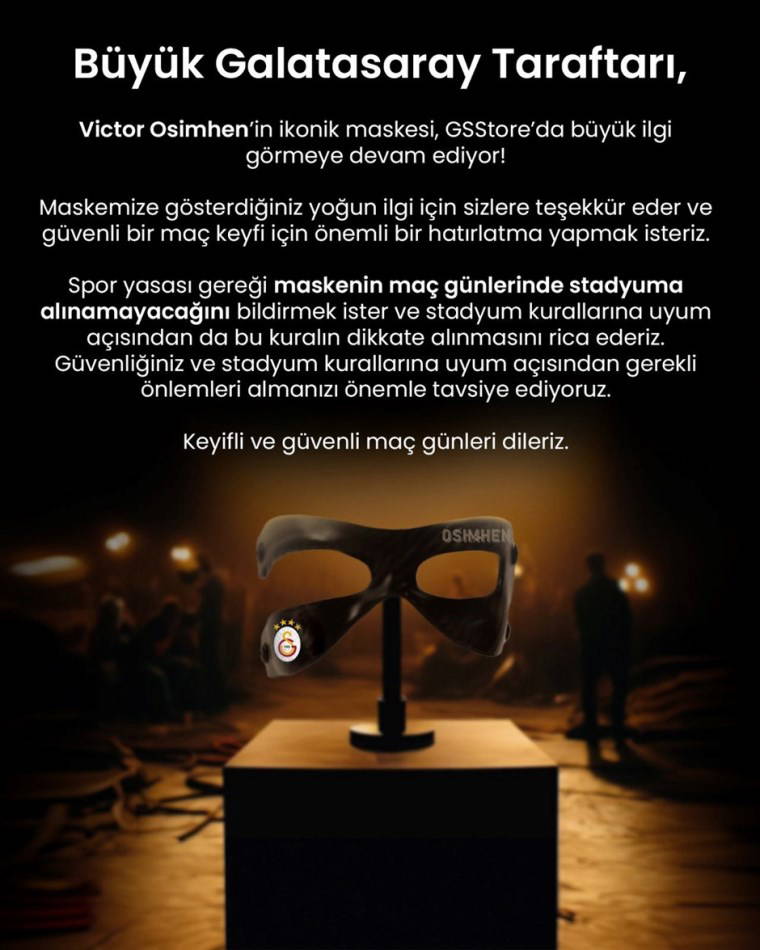 Galatasaray'dan yapılan açıklamada, "Büyük Galatasaray taraftarı, Victor Osimhen'in ikonik maskesi, GSStore'da büyük ilgi görmeye devam ediyor! Maskemize gösterdiğiniz yoğun ilgi için sizlere teşekkür eder ve güvenli bir maç keyfi için önemli bir hatırlatma yapmak isteriz. Spor yasası gereğince maskenin maç günlerinde stadyuma alınmayacağını bildirmek ister ve stadyum kurallarına uyum açısından da bu kuralın dikkate alınmasını rica ederiz. Güvenliğiniz ve stadyum kurallarına uyum açısından gerekli önlemleri almanızı önemle tavsiye ediyoruz. Keyifli ve güvenli maç günleri dileriz" ifadeleri yer aldı.