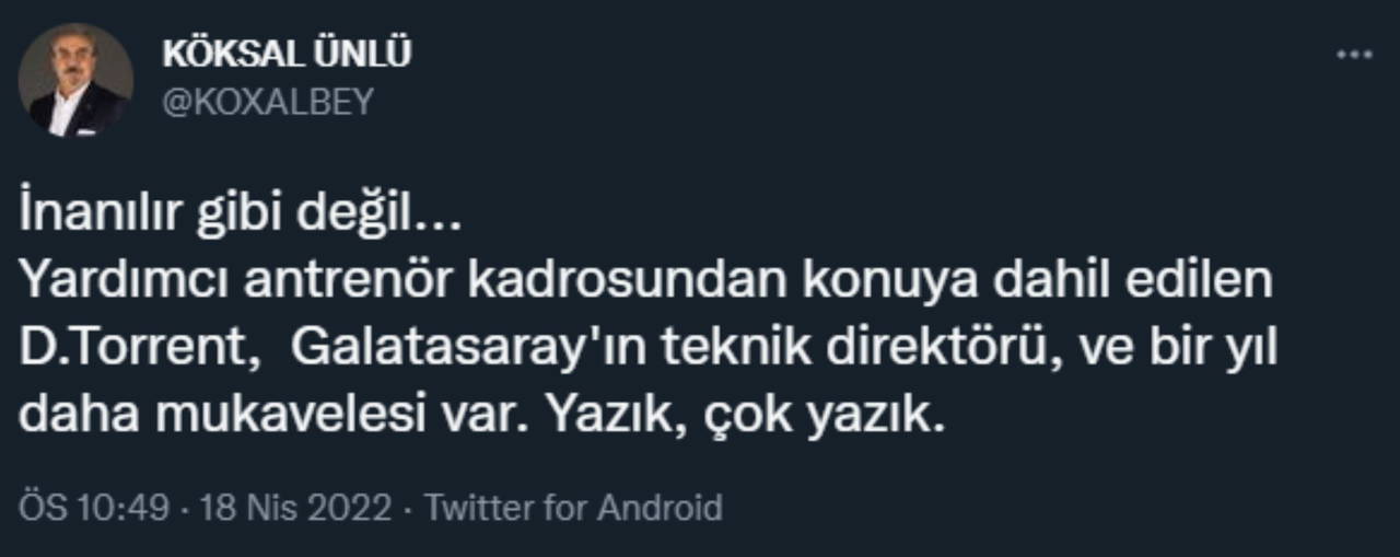 Maçın ardından Galatasaray'ın eski yöneticisi Köksal Ünlü, Domenec Torrent'i eleştirdi. Ünlü, "İnanılır gibi değil... Yardımcı antrenör kadrosundan konuya dahil edilen D.Torrent, Galatasaray'ın teknik direktörü, ve bir yıl daha mukavelesi var. Yazık, çok yazık" ifadelerini kullandı.