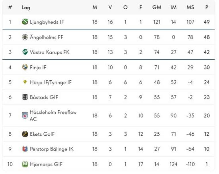 Ljungbyheds IF takımı 16 galibiyet 1 mağlubiyet ve 1 beraberlik alarak toplam 49 puanla şampiyon oldu.