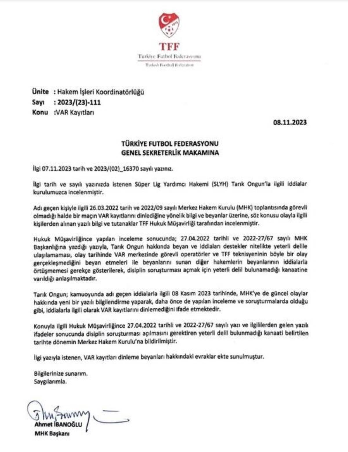 TFF, Süper Lig'de bir dönem yardımcı hakemlik yapan Tarık Ongun'un Galatasaray - Fenerbahçe maçının VAR kayıtlarını 'yetkisiz şekilde' dinlediğine yönelik bilgi ve beyanlar üzerine, söz konusu olayla ilgili kişilerden alınan yazılı bilgi ve tutanakları yayınladı.