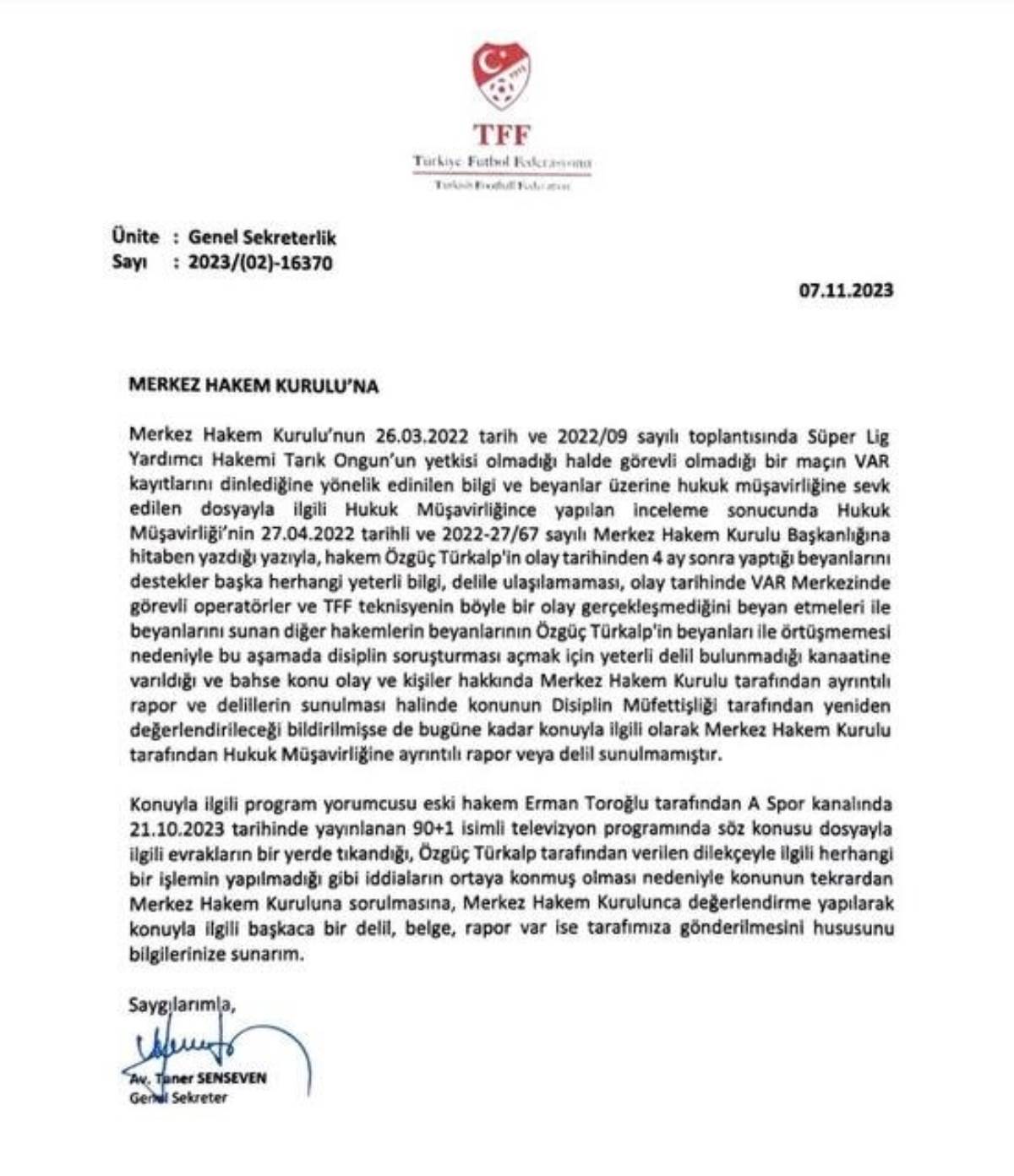 Raporun 7 Kasım 2023 tarihli üçüncü sayfasında ise Genel Sekreter Av. Taner Senseven imzasıyla bir belge yayınlandı. Bu belgede "Hukuk Müşavirligi'nin 27.04.2022 tarihli ve 2022-27 /67 sayılı Merkez Hakem Kurulu Başkanlığına hitaben yazdığı yazıyla, hakem Özgüç Turkalp'in olay tarihinden 4 ay sonra yaptığı beyanları destekler başka herhangi yeterli bilgi, delile ulaşılamaması, olay tarihinde VAR Merkezinde görevli operatörler ve TFF teknisyeninin böyle bir olay gerçekleşmedigini beyan etmeleri ile beyanlarını sunan diger hakemlerin beyanlarının Özgüç Türkalp'in beyanları ile örtüşmemesi nedeniyle bu aşamada disiplin soruşturması açmak için yeterli delil bulunmadığı kanaatine varıldığı ve bahse konu olay ve kişiler hakıında Merkez Hakem Kurulu tarafından ayrıntılı rapor ve delillerin sunulması halinde konunun Disiplin Mufettişligi tarafından yeniden değerlendirileceği bildirilmiise de bugune kadar konuyla ilgili olarak Merkez Hakem Kurulu tarafından Hukuk Müşavirliğine ayrıntılı rapor veya delil sunulmamıştır" denildi.