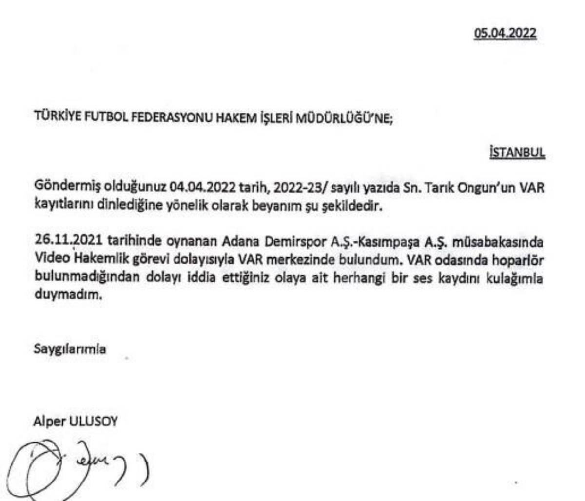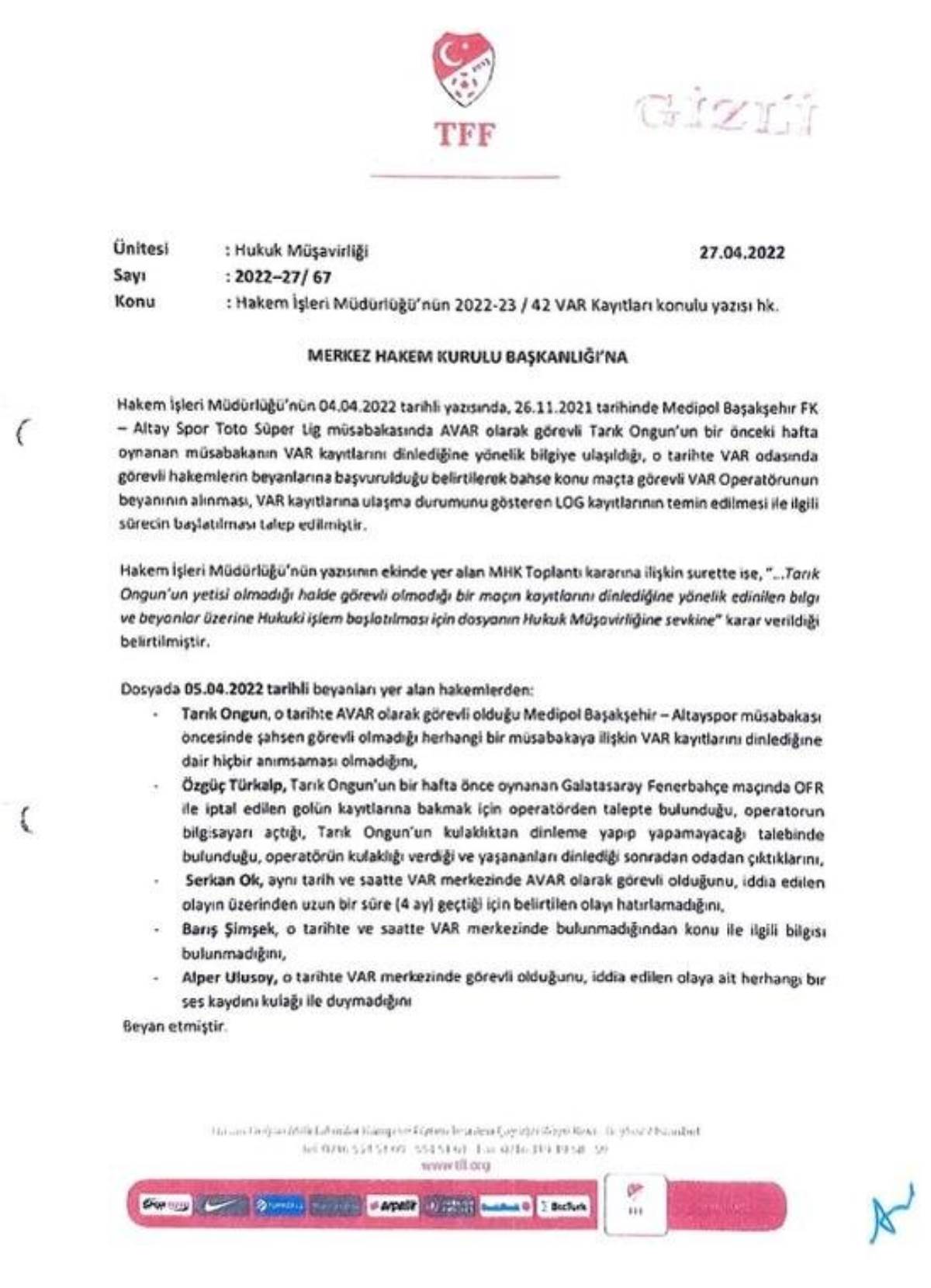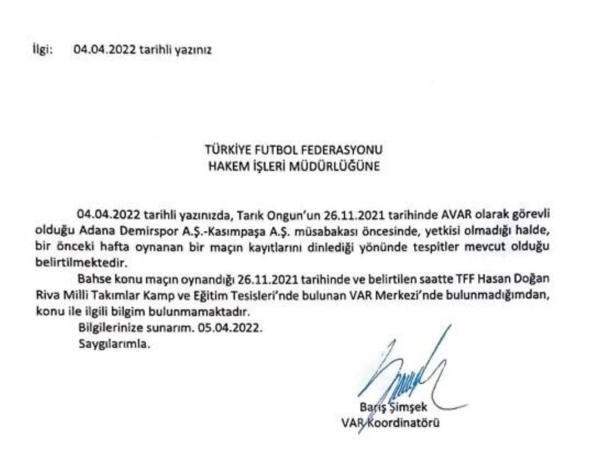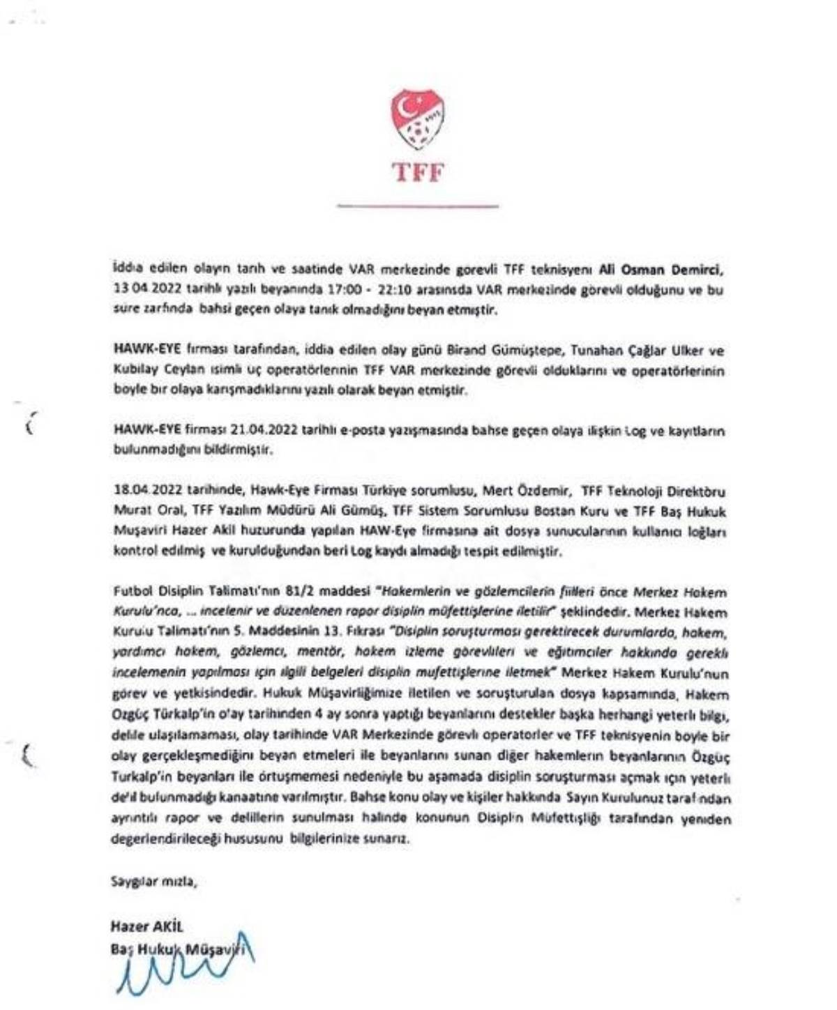 Raporun 8. sayfasında Hakem İşleri Müdürü Tayfur Özkan'ın TFF Hukuk Müşavirliği'ne yazdığı yazı yer aldı. Bu yazıda 'Bahse konu maçta görevli VAR operatörünün beyanı alınması ile ilgili sürecin başlatılmasını, ayrıca 2021-2022 Futbol Sezonuna ait VAR kayıtlarına ulaşma durumunu gösteren LOG kayıtlarının temin edilmesini saygı ile arz ederim' beyanı yer aldı.