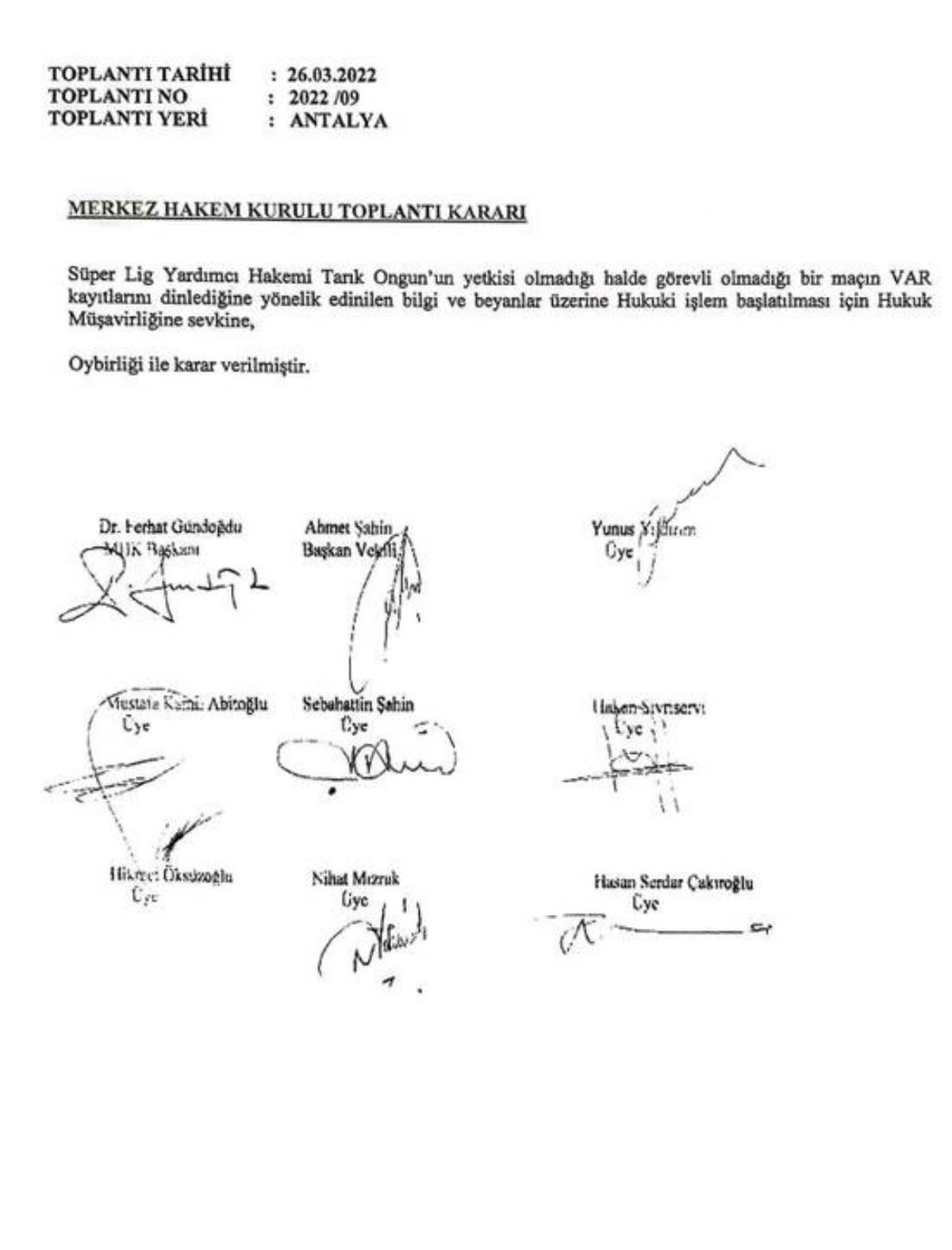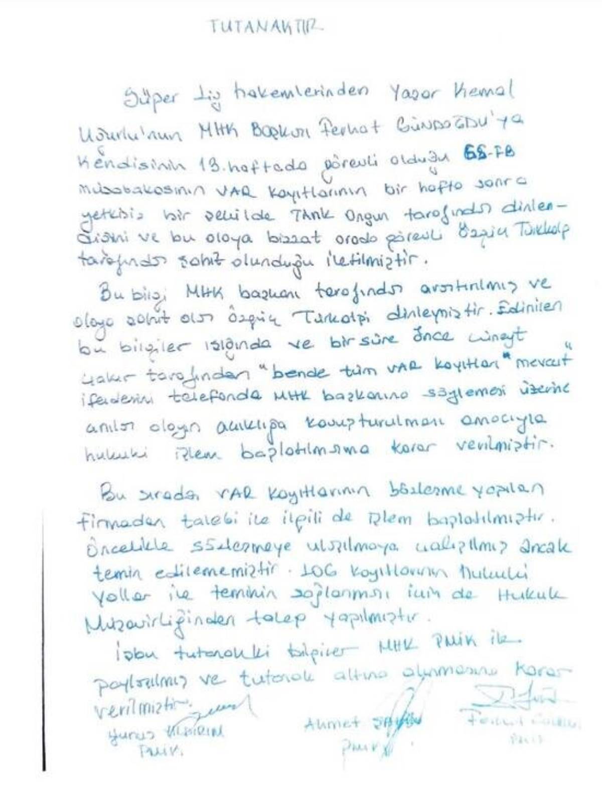 Raporun 7. sayfasında Ferhat Gündoğdu, Yunus Yıldırım ve Ahmet Şahin'in imzalarının bulunduğu, el yazısıyla yazılmış bir tutanak yer aldı. Bu tutanakta "Galatasaray - Fenerbahçe müsabakasının VAR kayıtlarının bir hafta sonrası yetkisiz bir şekilde Tarık Ongun tarafından dinlendiğini ve bu olaya bizzat orada görevi Özgüç Türkalp tarafından şahit olunduğu iletilmiştir. Bu bilgi MHK başkanı tarafından araştırılmış ve olaya şahit olan Özgüç Türkalp'i dinlemiştir. Edinilen bu bilgiler ışığında ve bir süre önce Cüneyt Çakır tarafından 'Bende tüm VAR kayıtları mevcut' ifadesini telefonda MHK başkanına söylemesi üzerine anılan olayın açıklığa kavuşturulması amacıyla hukuki işlem başlatılmasına karar verilmiştir" beyanları dikkat çekti.