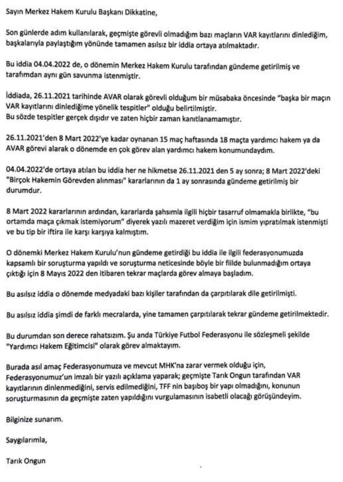 10. sayfada Tarık Ongun'un ifadeleri yer aldı. Tarık Ongun'un, "Asılsız iddia o dönemde medyadaki bazı kişiler tarafından çarpıtılarak dile getirilmişti. Bu durumdan son derece rahatsızım. Şu anda TFF ile sözleşmeli şekilde 'Yardımcı Hakem Eğitimcisi' olarak görev almaktaydım. Burada asıl amaç Federasyonumuza ve mevcut MHK'na zarar vermek olduğu için, Federasyonumuz'un imzalı bir yazılı açıklama yaparak; geçmişte Tarık Ongun tarafından VAR kayıtlarının dinlenmediğini, servis edilmediğini, TFF'nin başıboş bir yapı olmadığını, konunun soruşturmasının da geçmişte zaten yapıldığını vurgulamasının isabetli olacağı görüşündeyim" satırları bu sayfa yer aldı.