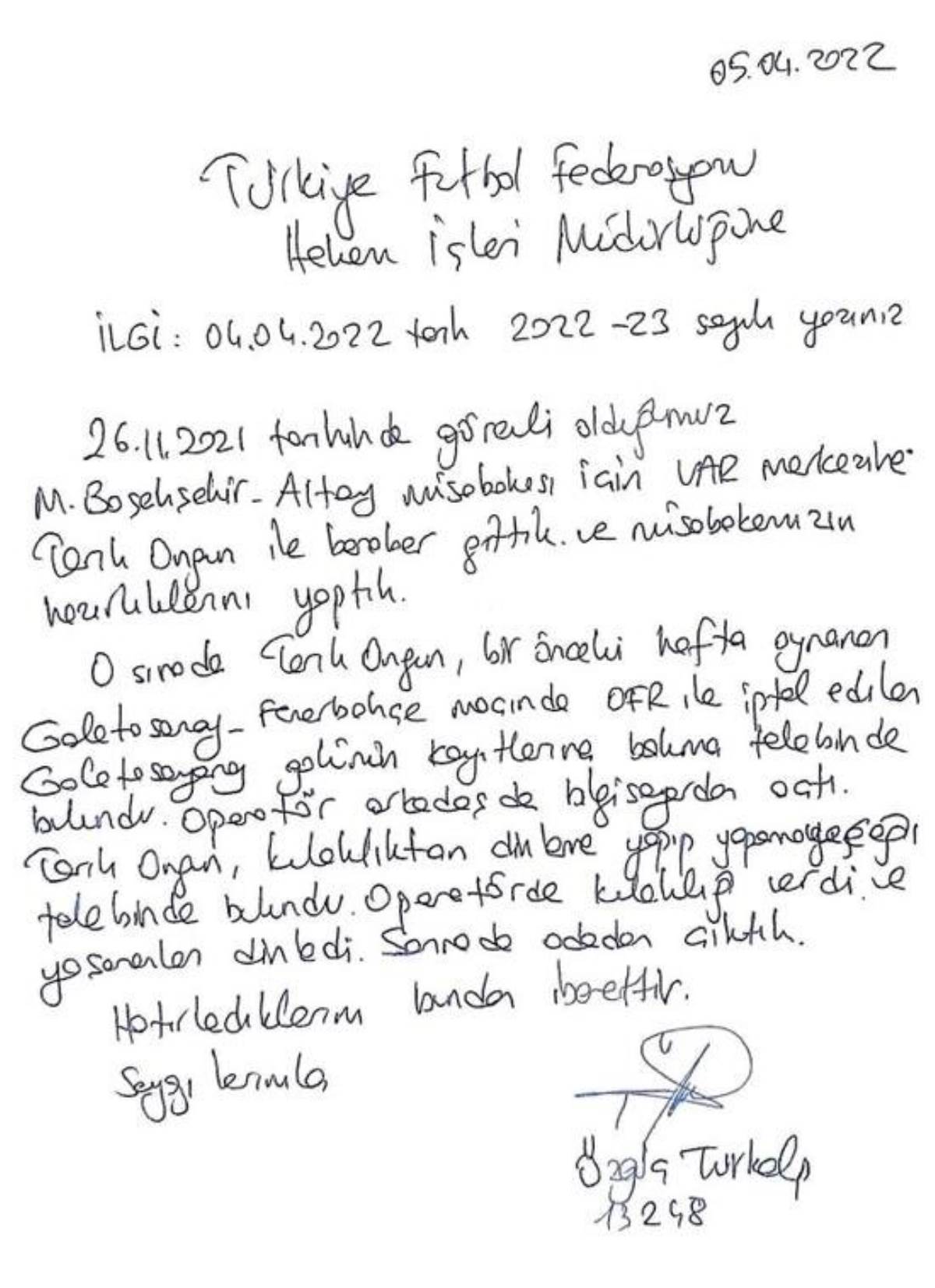 13. sayfada 5 Nisan 2022 tarihli Özgüç Türkalp'in el yazısıyla "Başakşehir - Altay müsabakası için VAR merkezine Tarık Ongun ile beraber gittik ve müsabakanın hazırlıklarını yaptık. O sırada Tarık Ongun, bir önceki hafta oynanan Galatasaray - Fenerbahçe maçında OFR ile iptal edilen Galatasaray golünün kayıtlarına bakma talebinde bulundu. Operatör arkadaş da bilgisayardan açtı. Tarık Ongun, kulaklıktan dinleme yapıp yapamayacağı talebinde bulundu. Operatör de kulaklığı verdi ve yaşananları dinledi. Sonra da odadan çıktık. Hatırladıklarım bundan ibarettir" dedi.