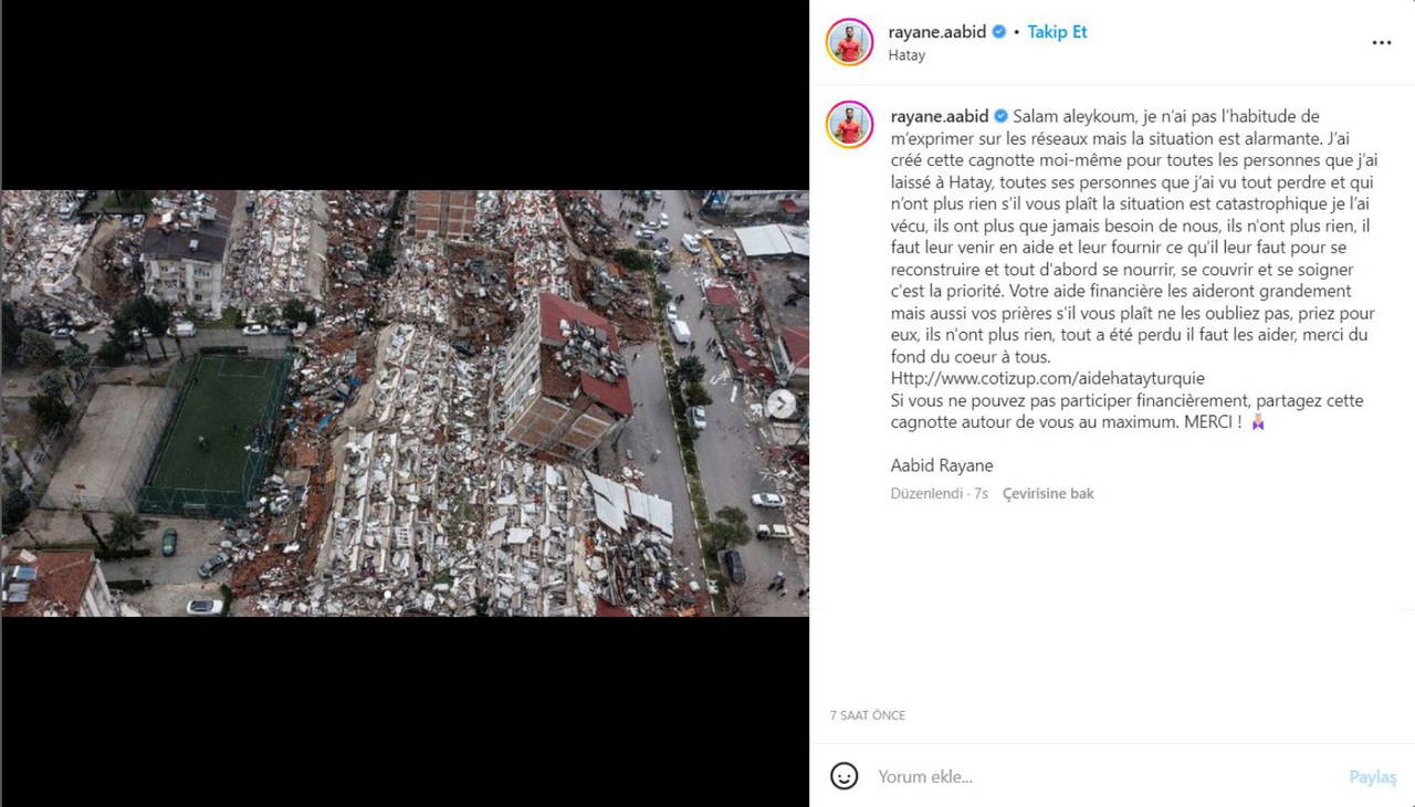 Depremden en çok etkilenen şehirlerden Hatay'da yaşayan Hataysporlu Rayane Aabid, Türkiye için yardım kampanyası başlattı.