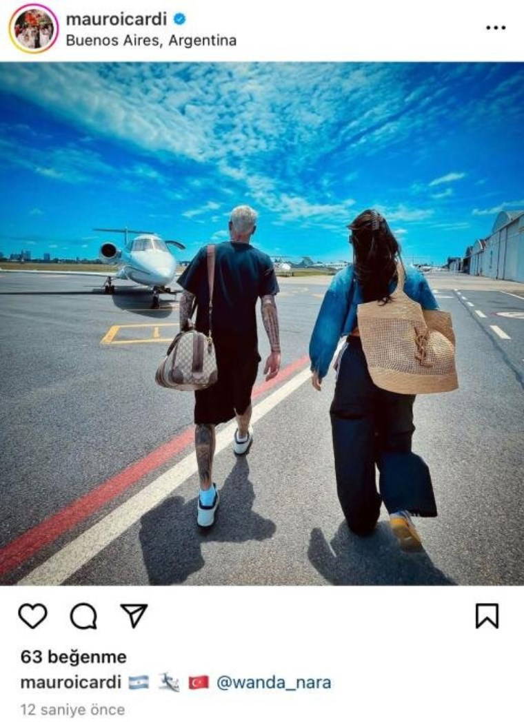 Eşi Wanda Nara ile birlikte havaalanından bir fotoğraf paylaşan golcü oyuncu, Arjantin ve Türkiye bayraklarıyla birlikte uçak emojisi kullanarak geri dönüş mesajı verdi.