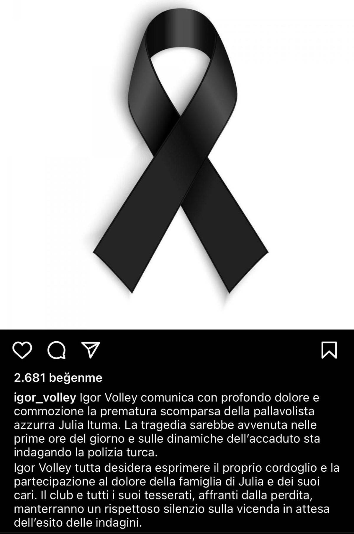 Igor Gorgonzola Novara, Eczacıbaşı ile karşılaştıkları ve 3-0 mağlup oldukları CEV Şampiyonlar Ligi yarı final rövanş maçının ardından, Üsküdar’da konakladıkları otelin penceresinden düşerek hayatını kaybeden 18 yaşındaki voleybolcu Julia Ituma’nın ölümüne ilişkin bir açıklama yayımladı.