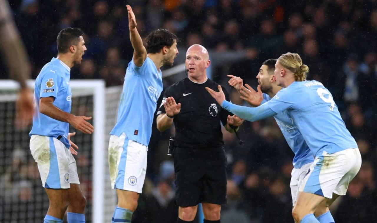 Ev sahibi ekibin oyuncuları, maçın son anlarında Jack Grealish'in kaleye doğru ilerlediği sırada Erling Haaland'a yapılan faul nedeniyle oyunu durduran hakem Simon Hooper'ın etrafını sarmıştı.