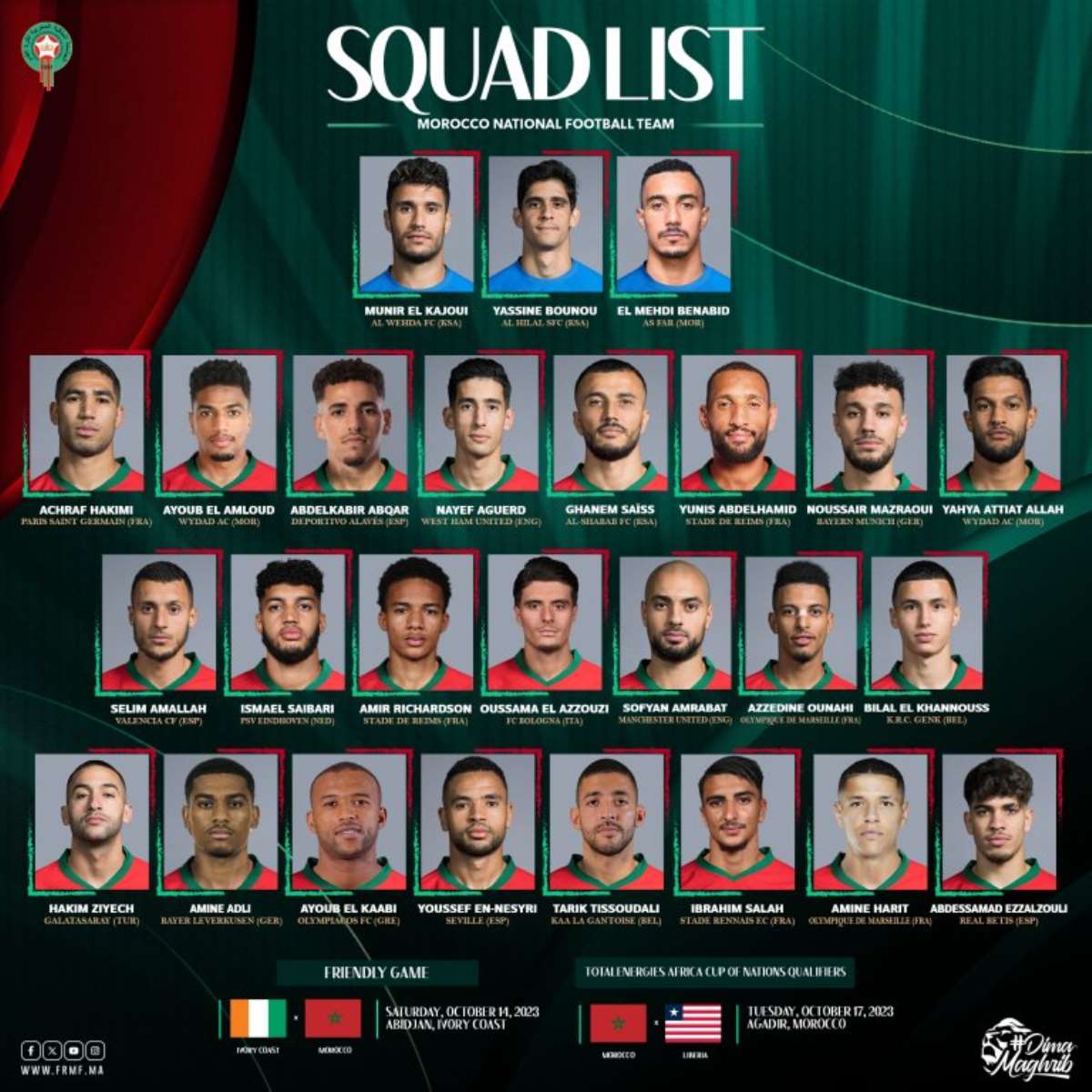Fas Milli Takımı'nın aday kadrosu şu şekilde: