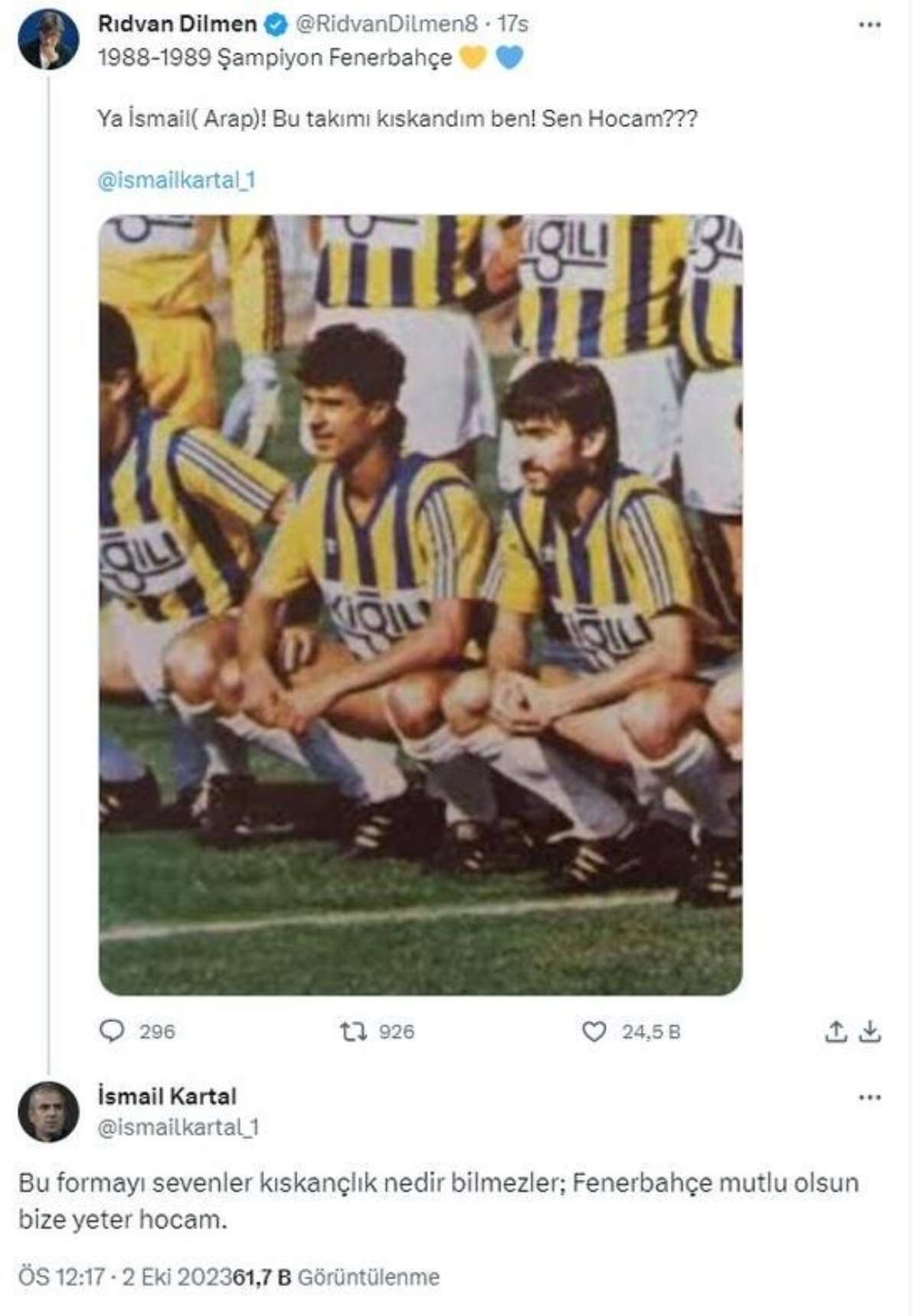 İsmail Kartal, Rıdvan Dilmen'in bu paylaşımına, "Bu formayı sevenler kıskançlık nedir bilmezler; Fenerbahçe mutlu olsun bize yeter hocam" diye karşılık verdi.