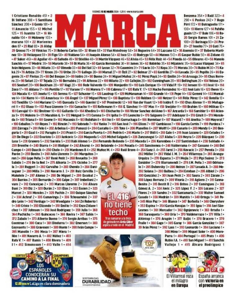 Marca, Real Madrid formasıyla en çok gol atan futbolcuları sıraladı. Arda Güler, bu sıralamada 416. sırada yer aldı ve gazetenin manşetine çıktı.