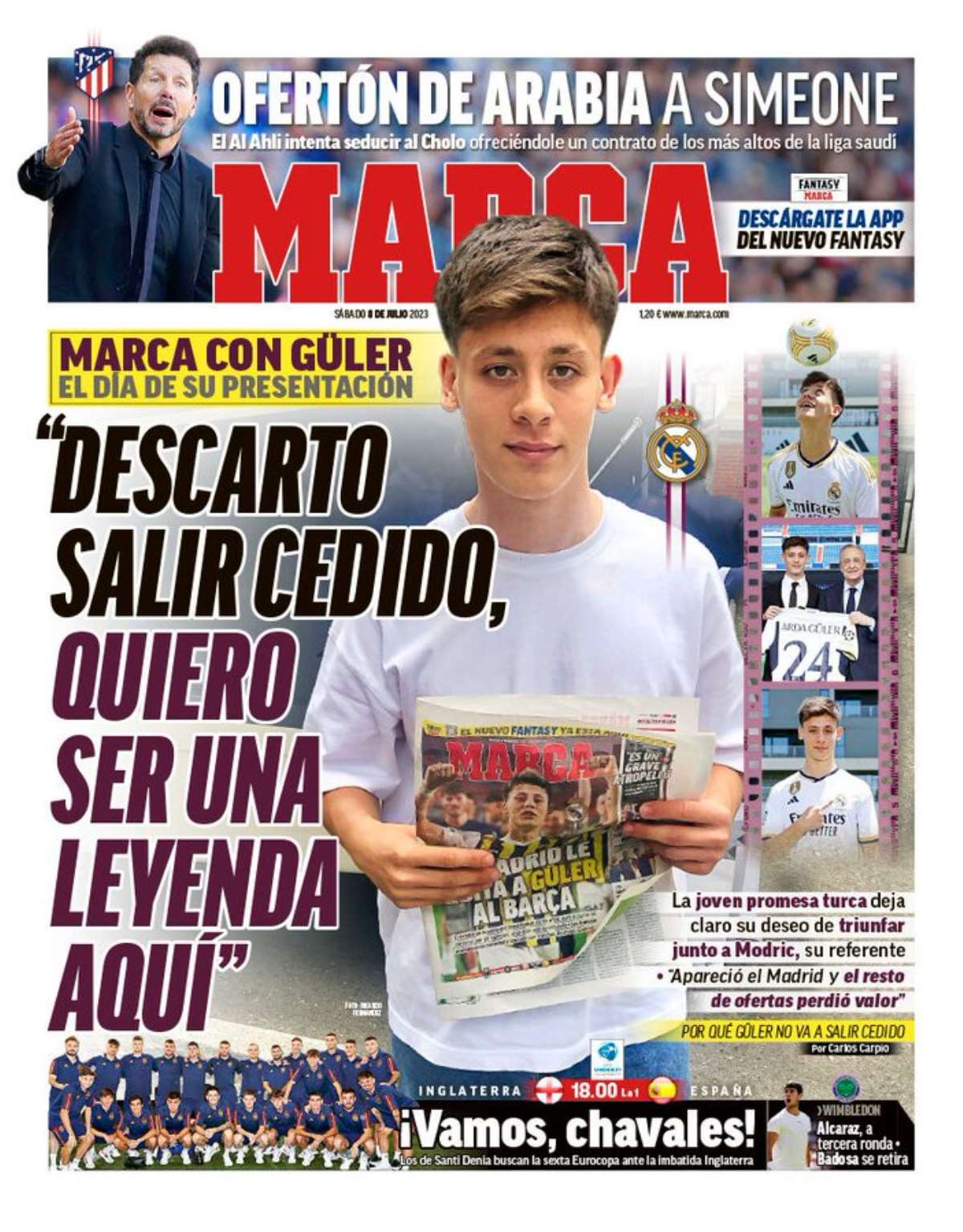 Marca gazetesi Arda Güler'in, "Kiralık olarak gitmiyorum. Real Madrid’de efsane olmak istiyorum" sözlerini kapağa taşıdı.