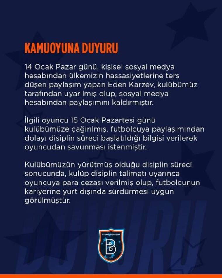 Başakşehir Kulübü, bu gelişmelerin ardından bir açıklama yaptı. Bu açıklamada, "Kulübümüzün yürütmüş olduğu disiplin süreci sonucunda, kulüp disiplin talimatı uyarınca oyuncuya para cezası verilmiş olup, Eden Karzev'in kariyerini yurt dışında sürdürmesi uygun görülmüştür" denildi.