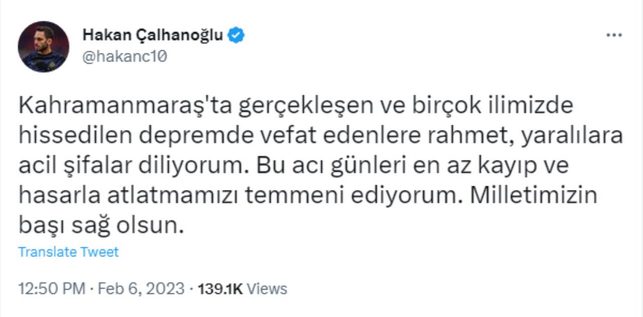 Inter takımında forma giyen milli futbolcu Hakan Çalhanoğlu, Twitter hesabından, "Kahramanmaraş'ta gerçekleşen ve birçok ilimizde hissedilen depremde vefat edenlere rahmet, yaralılara acil şifalar diliyorum. Bu acı günleri en az kayıp ve hasarla atlatmamızı temenni ediyorum. Milletimizin başı sağ olsun" paylaşımını yaptı.