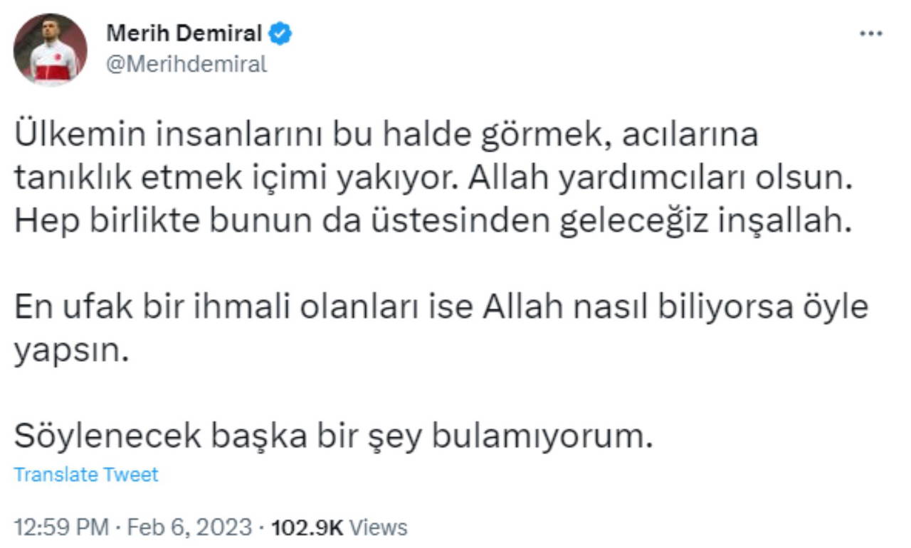 Atalanta takımında forma giyen milli futbolcu Merih Demiral da mesajında, "Ülkemin insanlarını bu halde görmek, acılarına tanıklık etmek içimi yakıyor. Allah yardımcıları olsun. Hep birlikte bunun da üstesinden geleceğiz inşallah. En ufak bir ihmali olanları ise Allah nasıl biliyorsa öyle yapsın. Söylenecek başka bir şey bulamıyorum" ifadelerini kullandı.