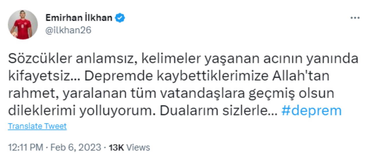 Sampdoria forması giyen genç Türk oyuncu Emirhan İlkhan da sosyal medyada, "Sözcükler anlamsız, kelimeler yaşanan acının yanında kifayetsiz... Depremde kaybettiklerimize Allah'tan rahmet, yaralanan tüm vatandaşlara geçmiş olsun dileklerimi yolluyorum. Dualarım sizlerle" paylaşımında bulundu.