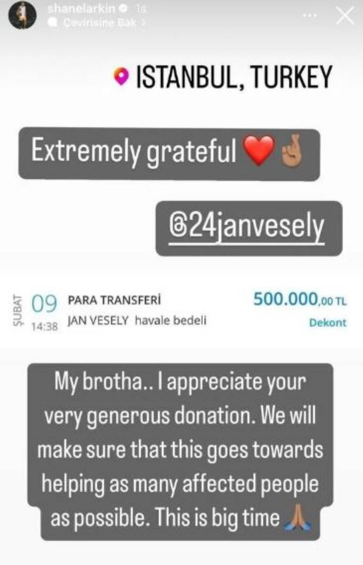 Fenerbahçe Beko Erkek Basketbol Takımı'nın eski oyuncusu Jan Vesely, Türkiye'deki depremzedeler için Shane Larkin Vakfı'na 500 bin lira bağış yaptı.