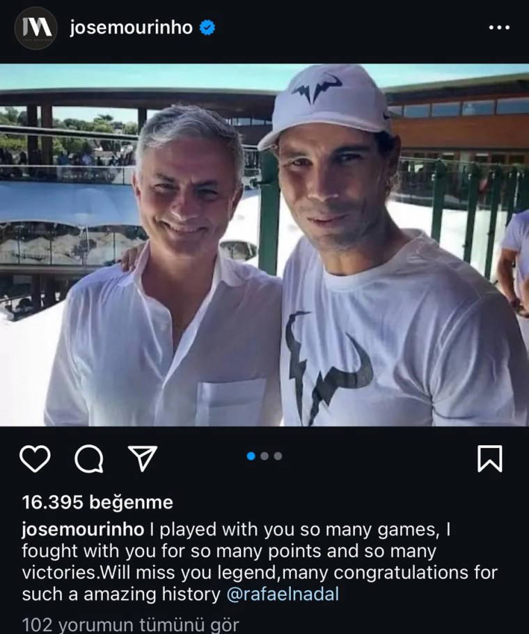 Nadal ile fotoğraflarını paylaşan Mourinho, paylaşımında, "Seninle çok fazla oyun oynadım, çok fazla puan ve zafer için savaştım. Seni özleyeceğim efsane. Böyle muhteşem bir tarih yazdığın için tebrikler" ifadelerini kullandı.