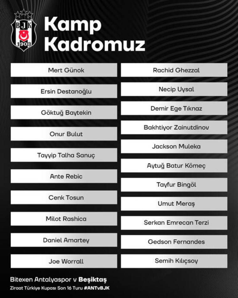 Beşiktaş'ın Antalyaspor maçı kamp kadrosu şu şekilde: