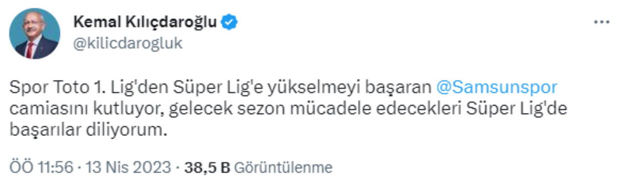 Kılıçdaroğlu, yaptığı paylaşımda, "Spor Toto 1. Lig'den Süper Lig'e yükselmeyi başaran Samsunspor camiasını kutluyor, gelecek sezon mücadele edecekleri Süper Lig'de başarılar diliyorum" ifadelerini kullandı.