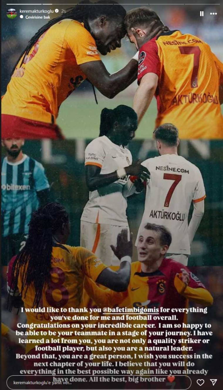 Kerem, futbol kariyerini noktalayan Gomis için yaptığı paylaşımda, "İnanılmaz kariyerin için tebrikler. Yolculuğunun bir aşamasında takım arkadaşın olduğum için çok mutluyum. Senden çok şey öğrendim. Sen sadece kaliteli bir forvet ya da futbolcu değilsin, aynı zamanda doğal bir lidersin. Bunun ötesinde harika bir insansın. Hayatının bundan sonra bölümünde sana başarılar diliyorum. Şimdiye kadar yaptığın gibi yine her şeyi en iyi şekilde yapacağına inanıyorum. Her şey dilediğin gibi olsun." ifadelerini kullandı.