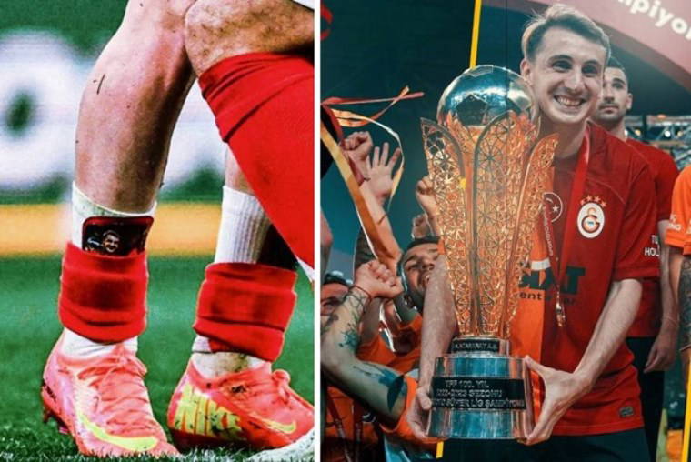 Tekmeliklerin üzerinde Kerem Aktürkoğlu'nun Galatasaray'da oynadığı dönemden şampiyonluk kupasıyla bir pozunun olduğu görüldü.