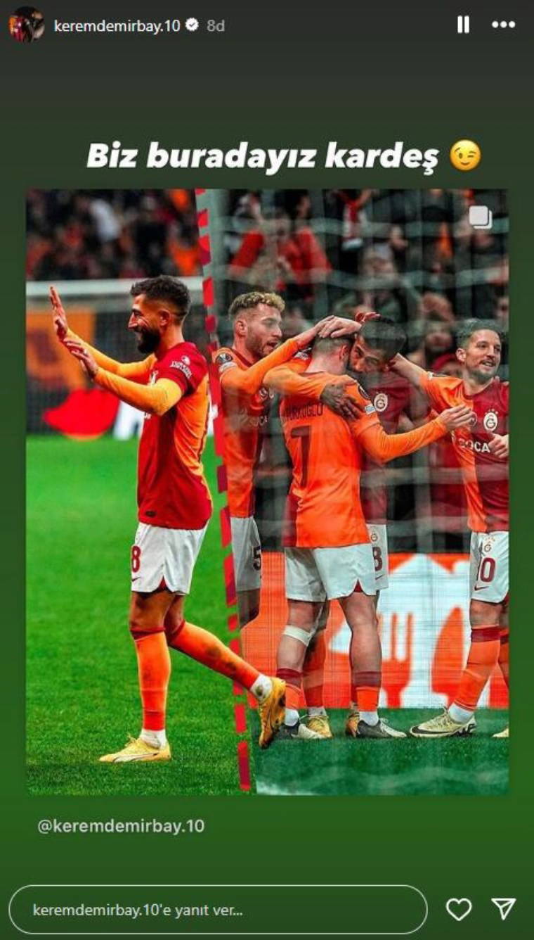 Karşılaşmada Galatasaray’ı 19. dakikada öne geçiren golü atan Kerem Demirbay, yaptığı paylaşımda fileleri havalandırdıktan sonraki sevinç görselini kullanarak, “Biz buradayız kardeş” ifadelerini ve göz kırpma emojisi kullandı.